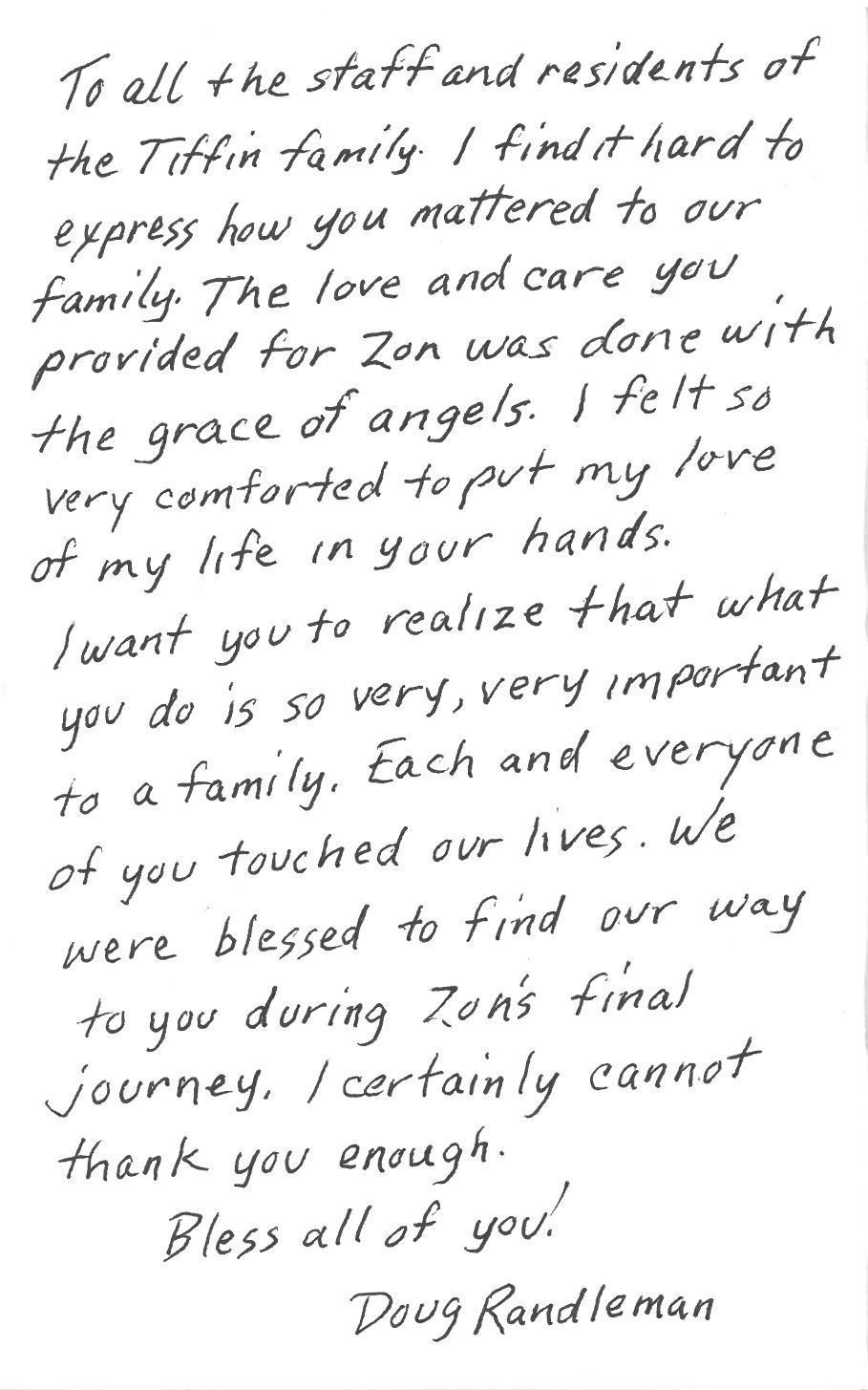 "It is very difficult to completely express our love and appreciation for the Tiffin House Assisted Living and Memory Care Community and, for you, Justin. The Tiffin House was the best thing that could have ever happened to Emory, and, to me."