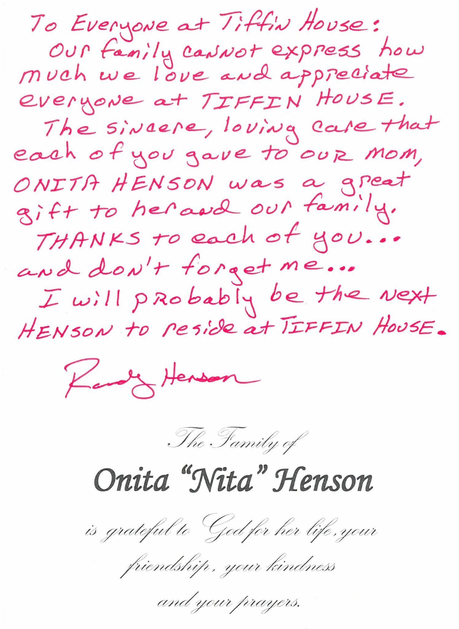 "We would like to take the opportunity to thank all Tiffin House for the personalized care, respect, and love given to our Mother Lorena during her stay. She really loved all of you for the many ways you assisted her in her daily life."